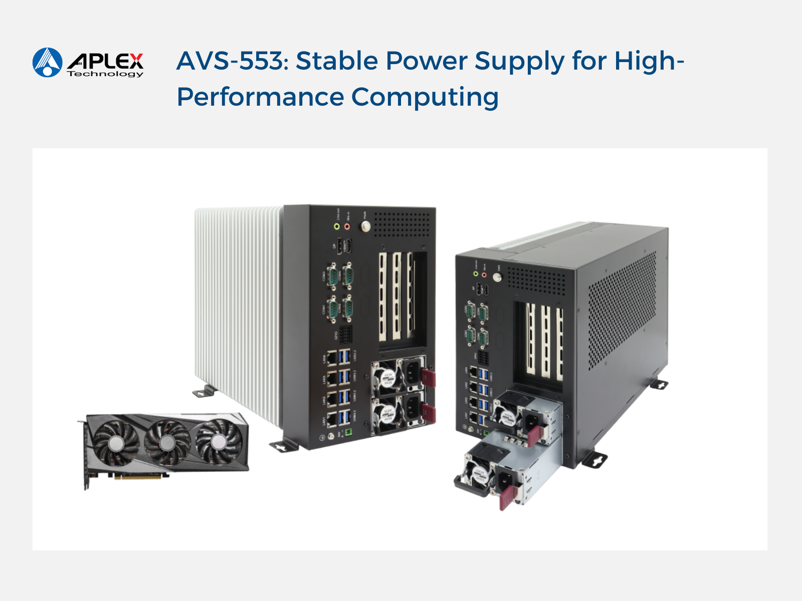 AVS-553 is equipped with 8 x USB 3.2 Gen2 Type-A, 6 x COM (including 2 optional) for peripheral connectivity, 4 x 2.5G LAN for internet connectivity, 8 x GPIO for flexible control integration along with 1 x DP and 1 x HDMI output supporting resolutions up to 8K for high-quality images.For expansion, AVS-553 provides a wide range of options. It supports wireless communication modules, including Wi-Fi via 1 x Mini PCIe and 4G/5G connectivity via 1 x M.2 B-Key. In addition, it supports expansion cards for further expansions, enabling flexible GPU upgrades and rich I/O configurations to accelerate AI workloads and adapt to diverse application requirements.To ensure stable and reliable operation, the AVS-553 is equipped with redundant, dual hot-swappable CRPS power supplies. Each CRPS module features a modular design and can deliver up to 550W, with the option to upgrade to 1100W for high-end graphics cards. The power redundancy system enhances reliability with uninterrupted 24/7 operation even during unexpected power supply failures. With its modular design, it also ensures a stable power supply for high-performance computing.