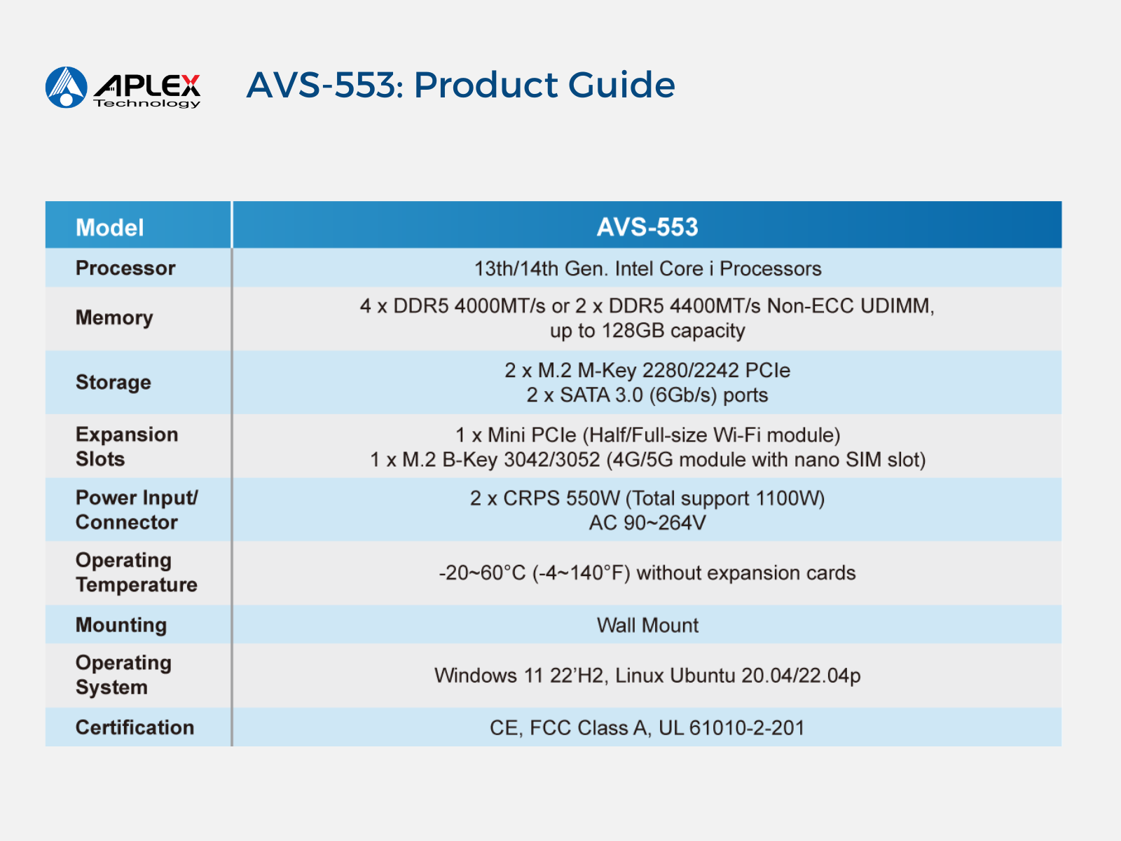 Aplex, Taipei, Taiwan, 25.09.2025 - APLEX Technology Inc., a global pioneer in industrial computer solutions, is proud to introduce the latest edge AI system - AVS-553. It features powerful computing performance 13th/14th Gen. Intel Core i processors and expandable GPU and I/O supports, making it an ideal option for applications that require advanced AI capabilities such as machine vision, data analytics and process automation.