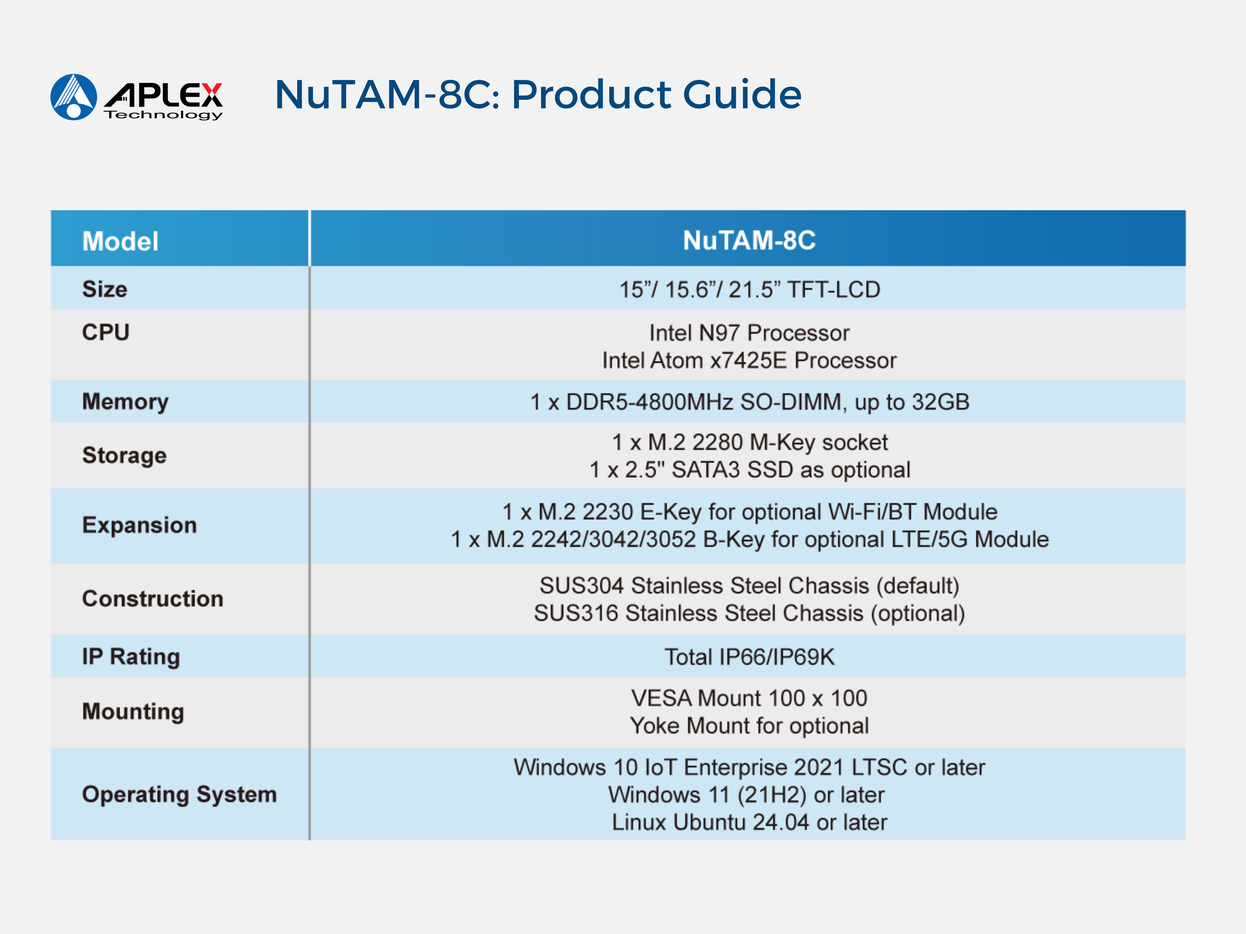 Aplex, Taipei, Taiwan, 29.01.2026 - APLEX Technology Inc.,a global provider of industrial computing solutions, is thrilled to introduce the upcoming NuTAM series lineup - the NuTAM-8C. Designed for high-hygiene industrial environments, the NuTAM series supports multiple processor platforms, offering a full spectrum of performance options. From the Intel core ultra-powered NuTAM-9E to Intel Alder Lake-N powered NuTAM-8C, APLEX provides a complete range of TFT-LCD panel sized from 15” to 21.5”, ensuring flexibility across diverse applications.