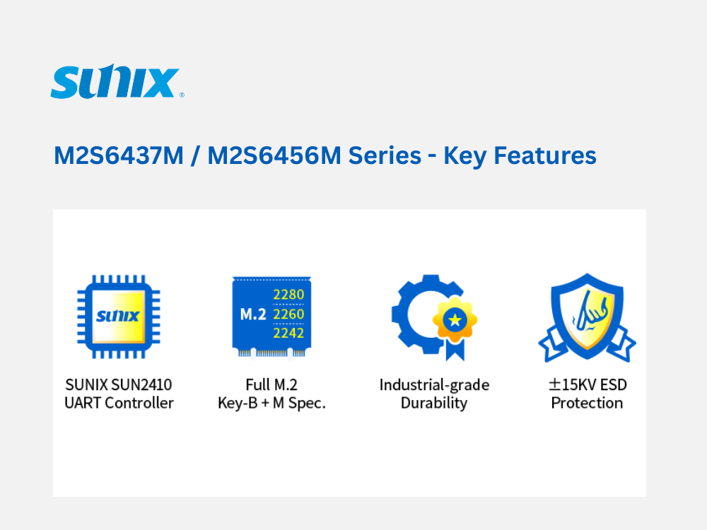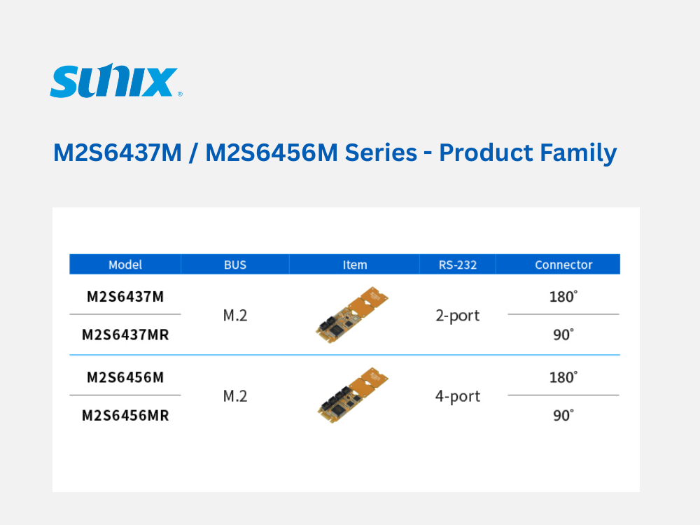 SUNIX, Taiwan, 11.09.2025 - As smart industry, automation, and high-speed data applications continue to evolve, the demand for flexible expansion interfaces, stable data transmission, and easy deployment is stronger than ever. SUNIX proudly introduces the new M2S6437M / M2S6456M Series, building on the proven stability of its predecessor while adding full-size M.2 slot support, greatly enhancing compatibility and expanding application possibilities for embedded and edge computing systems.