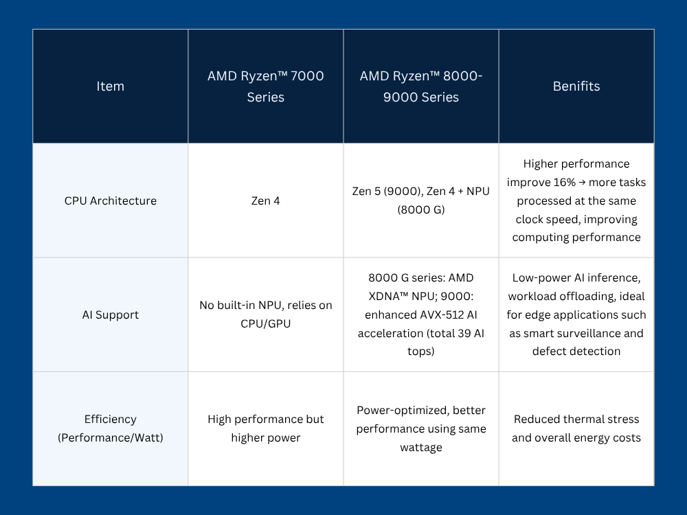 Zen 4 (Ryzen™ 7000–8000 series) and Zen 5 (Ryzen™ 9000 series) architectures provide approximately 16% higher performance, accelerating AI inference and image analysis, reducing processing time, and ensuring more efficient and stable industrial operations.