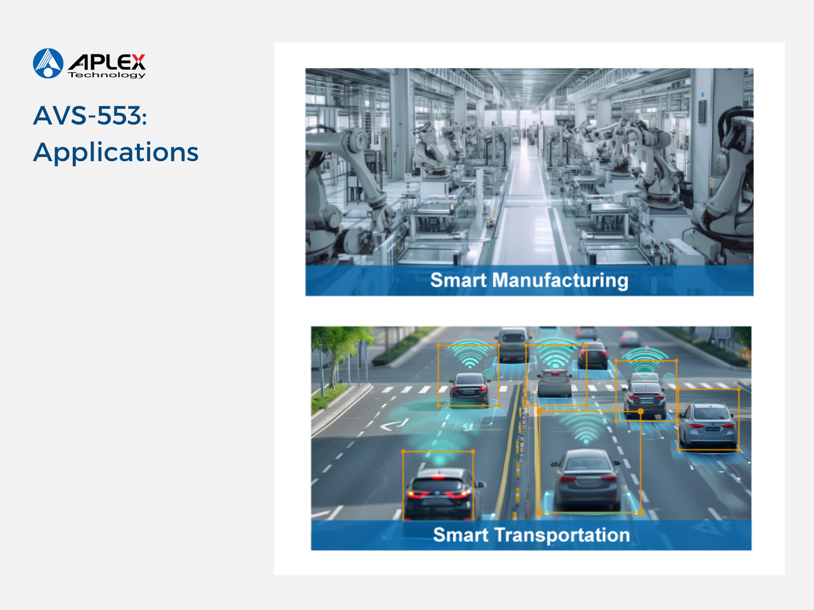 AVS-553 is designed to integrate seamlessly into a wide range of applications. With its AI computing capability and flexible I/O configuration such as USB, GbE LAN, COM, and more, it can easily connect with robotic arms, cameras and other peripherals to enhance the efficiency in smart manufacturing. In smart transportation, AVS-553 can effectively analyze real-time data and enable intelligent decision-making through machine vision. This not only improves operational efficiency but also enhances convenience and ensures safety in critical environments.Combined all the advantages, AVS-553 is engineered to maintain stable performance under both standard and demanding industrial conditions. It supports versatile integration and expansion, while delivering rugged, durable and high-performance computing to enable 24/7 AI-driven automation. From smart manufacturing, industrial automation to smart transportation. AVS-553 empowers businesses to enhance efficiency, accuracy, and responsiveness. By deploying edge AI at the source, it not only accelerates digital transformation but also strengthens long-term competitiveness in the era of Industry 4.0.